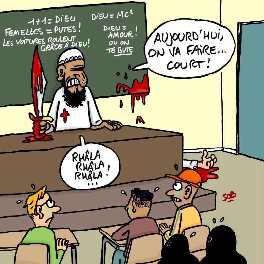 C'est vrai qu'ils sont pas trop habitués aux caricatures , au centre culturel Frere Tariq , sur les tubes de Biactol et Youporn yana pas tropVictor a écrit : 03 novembre 2020 19:32Tu sais, il y a bien d'autres pays démocratiques où la liberté religieuse existe (tout comme l'athéisme) mais ils ne sentent pas obligés pour cela de montrer des caricatures blasphématoires à des mômes dans des collèges.Crapulax a écrit : 02 novembre 2020 04:42