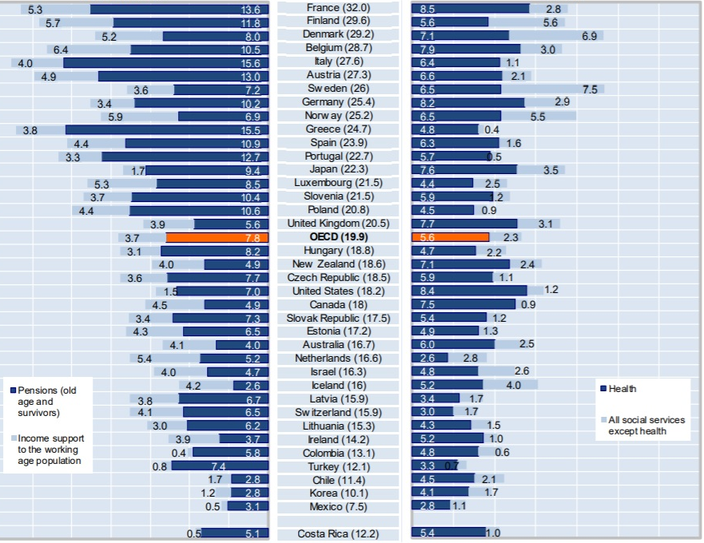 Comme dans le reste des pays de l'OCDE, la plus grosse part de ces dépenses sociales est dédiée aux pensions de retraite et de réversion ainsi qu'au système de santé. Les retraites et réversion pèsent 13,6% du PIB français, plus que la moyenne (7,8%) mais moins qu'en Italie et en Grèce où elles représentent plus de 15% du PIB.